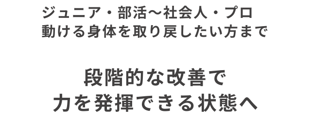 痛みが出る動作(投げる、ジャンプ、踏み込む等)を確認し、負担の少ない動きにしていくことで、再発しにくい身体を目指せます。