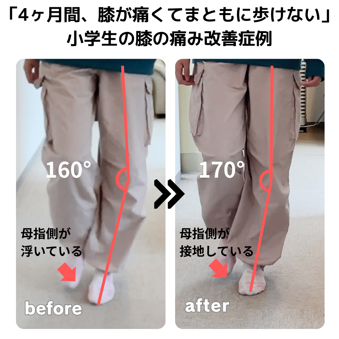 •結果:すべての動作で痛み改善 片足立ち時の膝角160°→170°