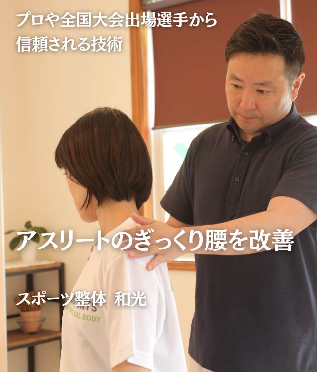 「何をやってもどこに行っても改善しない症状」や「いつまでも改善しない症状」は、当院のスポーツ整体で改善できます。